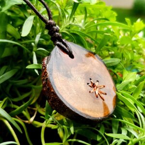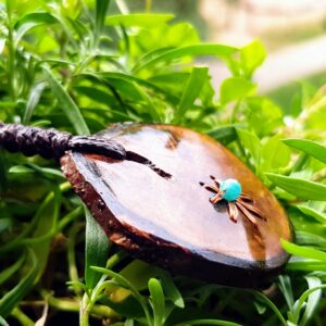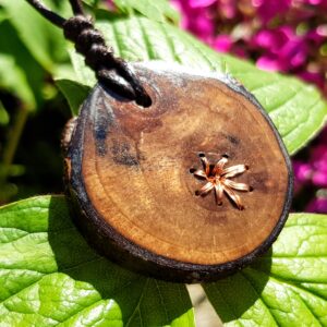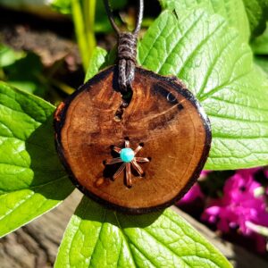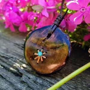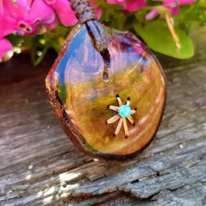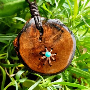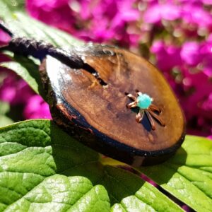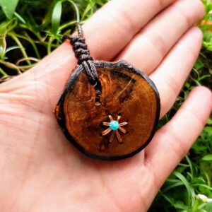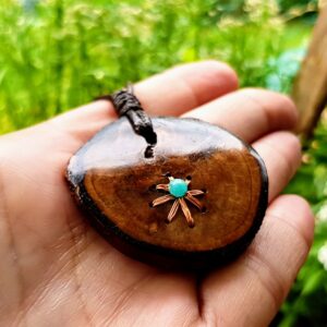 Ten naturalny naszyjnik z Orzecha Włoskiego z Amazonitem wykonany jest z odzyskanego drewna i miedzi.