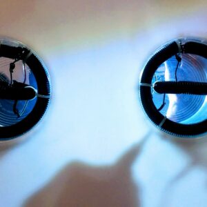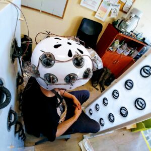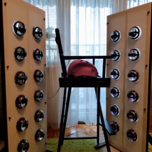 System balansujący składa się z dwóch ścian z cewkami, krzesła i kasku.
